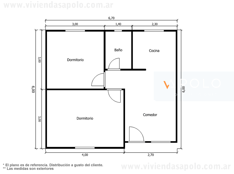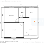 Vivienda Industrializada de 40 metros cuadrados de 2 Dormitorios. Con paredes de fibrocemento en su parte exterior y durlock en su parte interior. Techo de chapa sincalum trapezoidal. Cielorraso de machimbre. Ventanas de aluminio vidrio entero de 1m x 1,10m. Puerta de ingreso de chapa doble inyectada. Puertas placas en el interior. Instalación Eléctrica (Caños corrugados y cajas de luz colocados. Sin Cableado). Instalación de caños agua.
